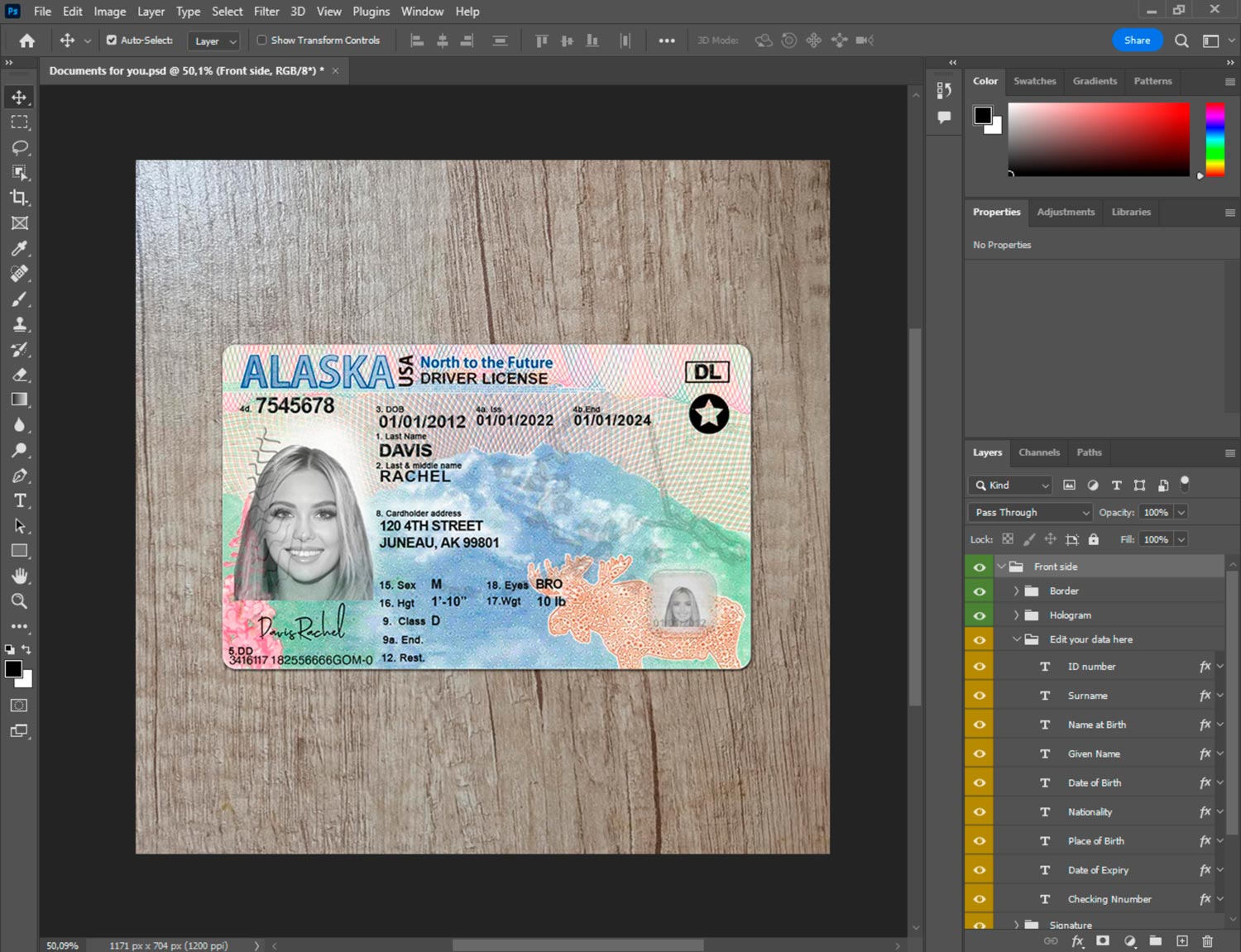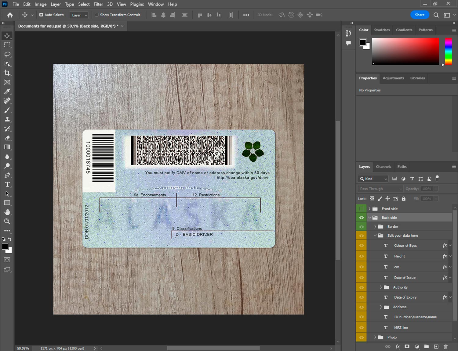 Alaska driver’s license PSD—print-ready, layered, and professional. Ideal for simulations and UI walkthroughs. Edit core fields, swap photo/signature, and render 300 DPI PDF/JPEG. Visual prop only—no RFID/barcode. CR-80 format with bleed and baseline grid.