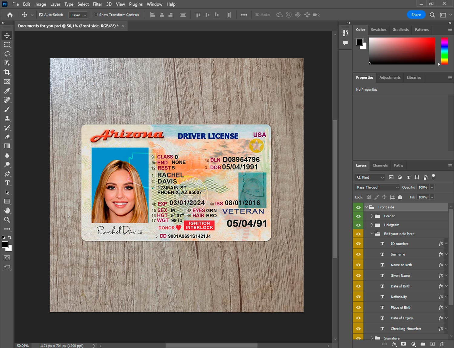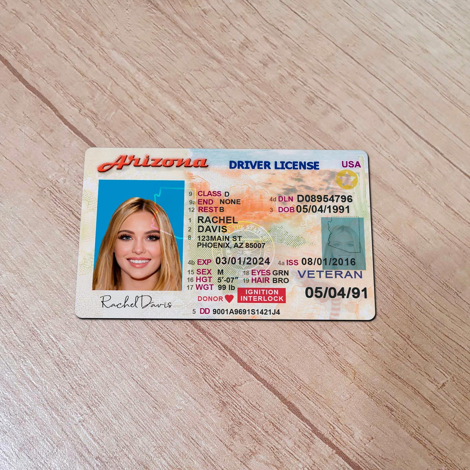Crafted to reflect the current visual standards of Arizona’s official license design, this editable ID replica includes: