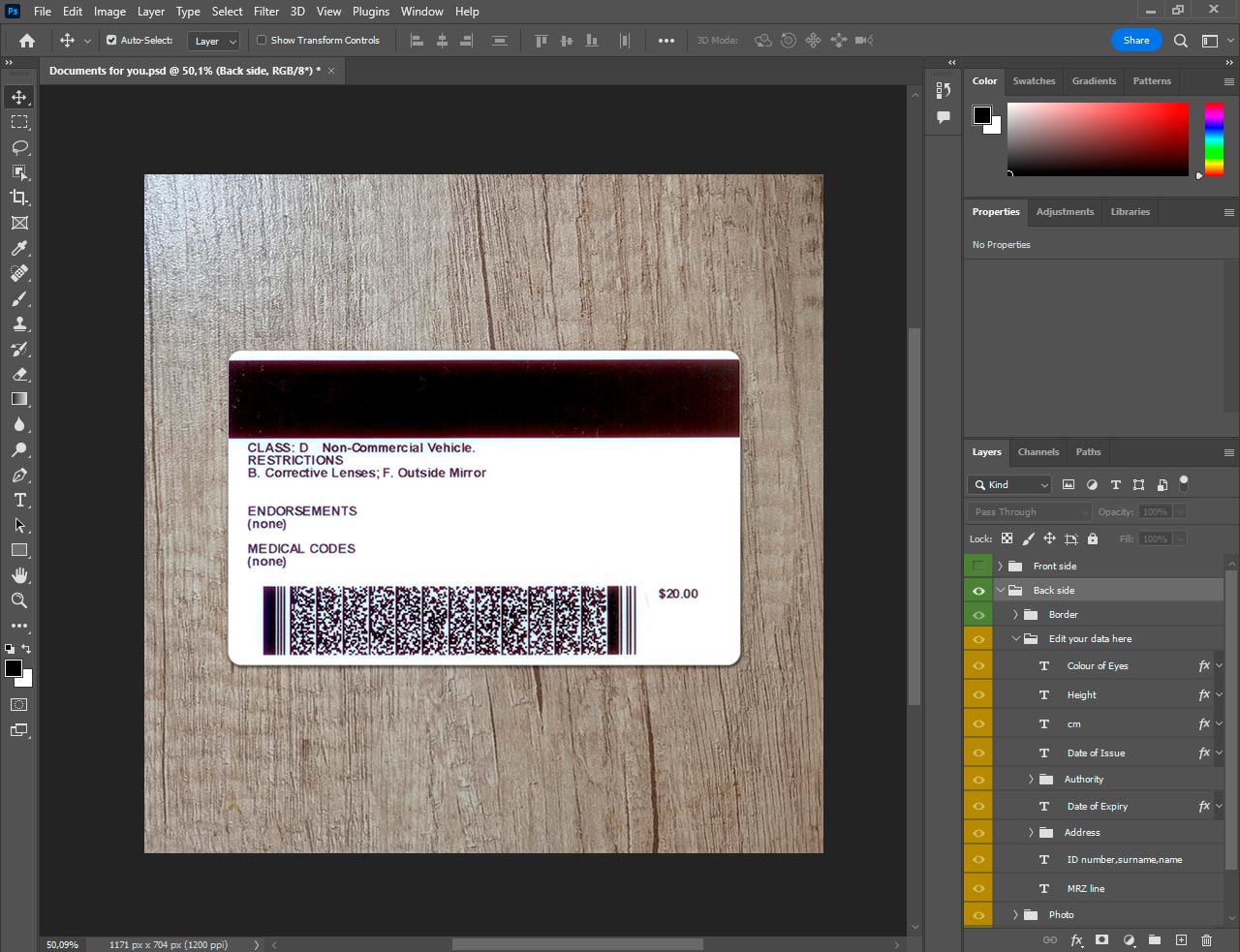 Included are real-style design elements: barcodes, hologram overlays, address blocks, font sets, and photo fields. The template is printable and scannable, though we offer only digital copies — no physical cards.