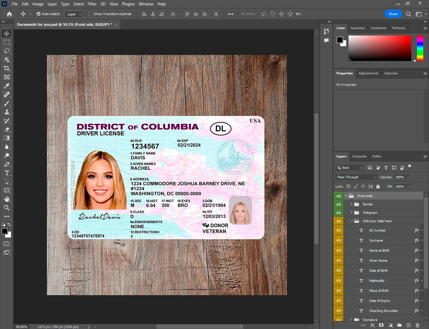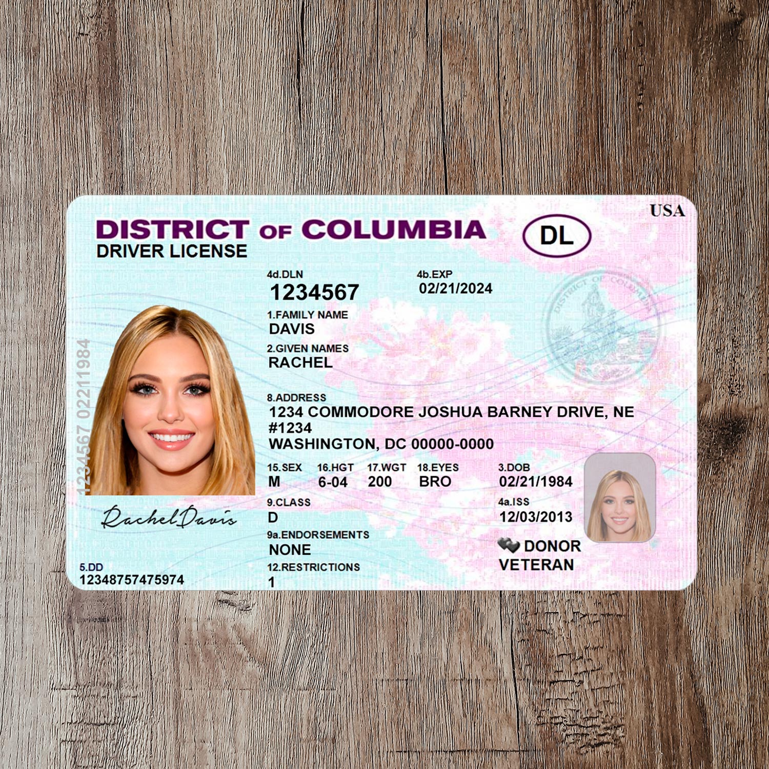 Columbia driver’s license maker—DIY template for Photoshop. Modern DMV-style design, organized layers, and included fonts. Print at 300 DPI to PDF/JPEG. Visual mock only—no magstripe/RFID encoding. CR-80 size with bleed marks, smart-object photo and signature, editable ID details.