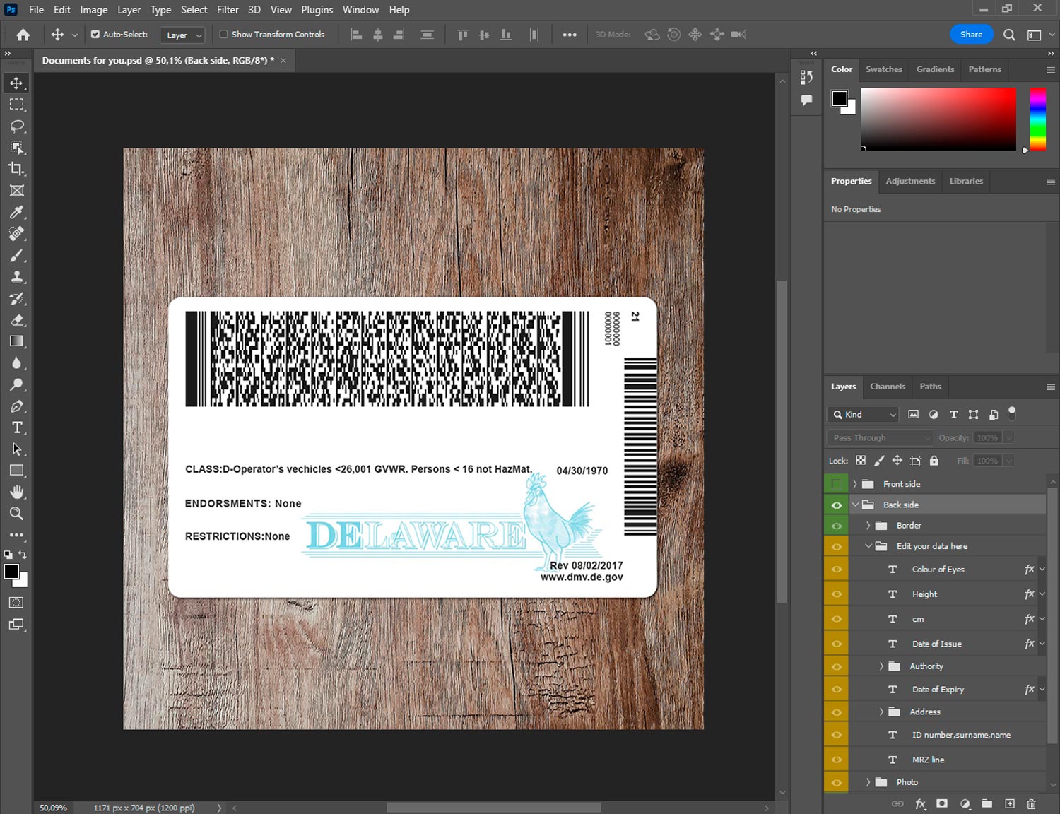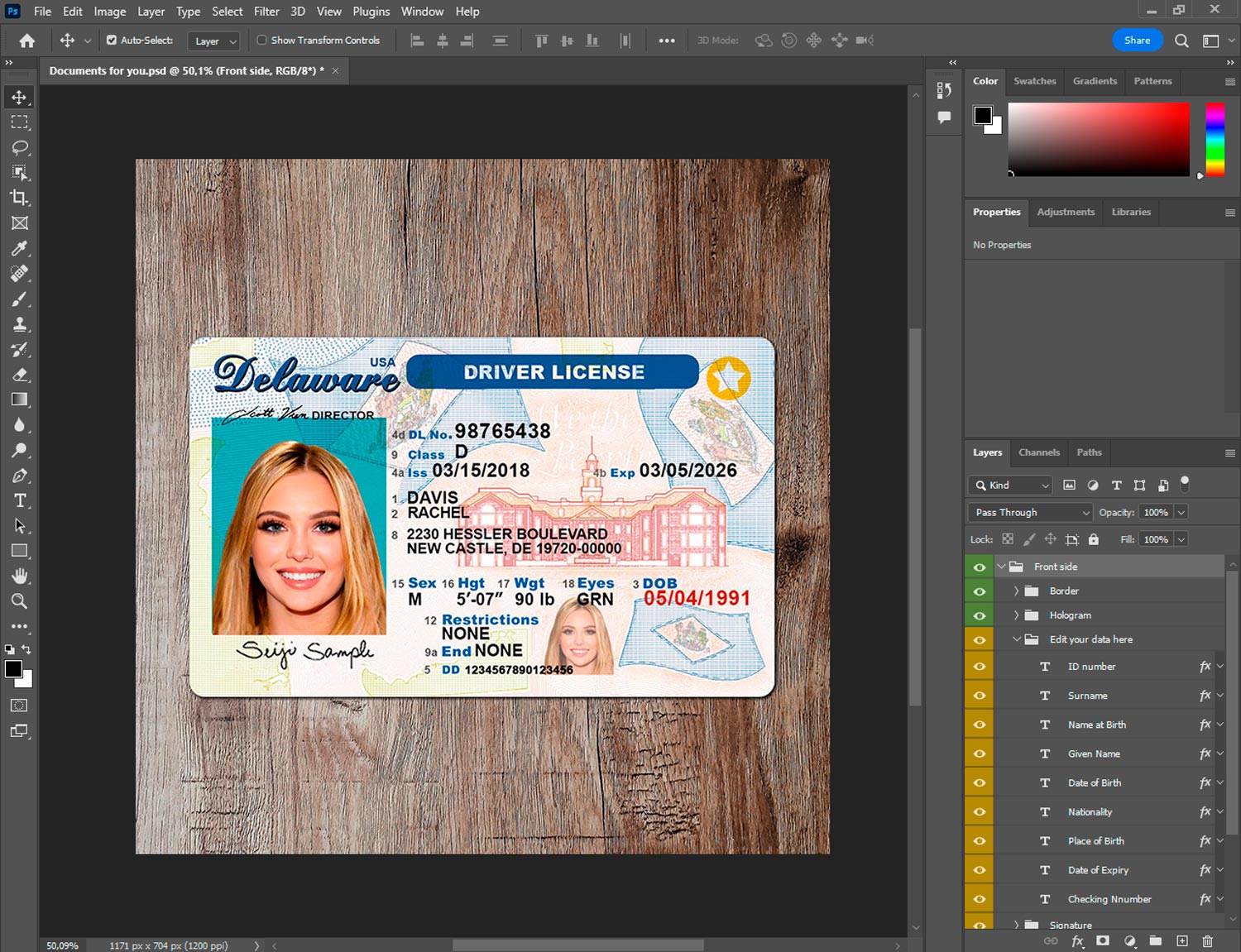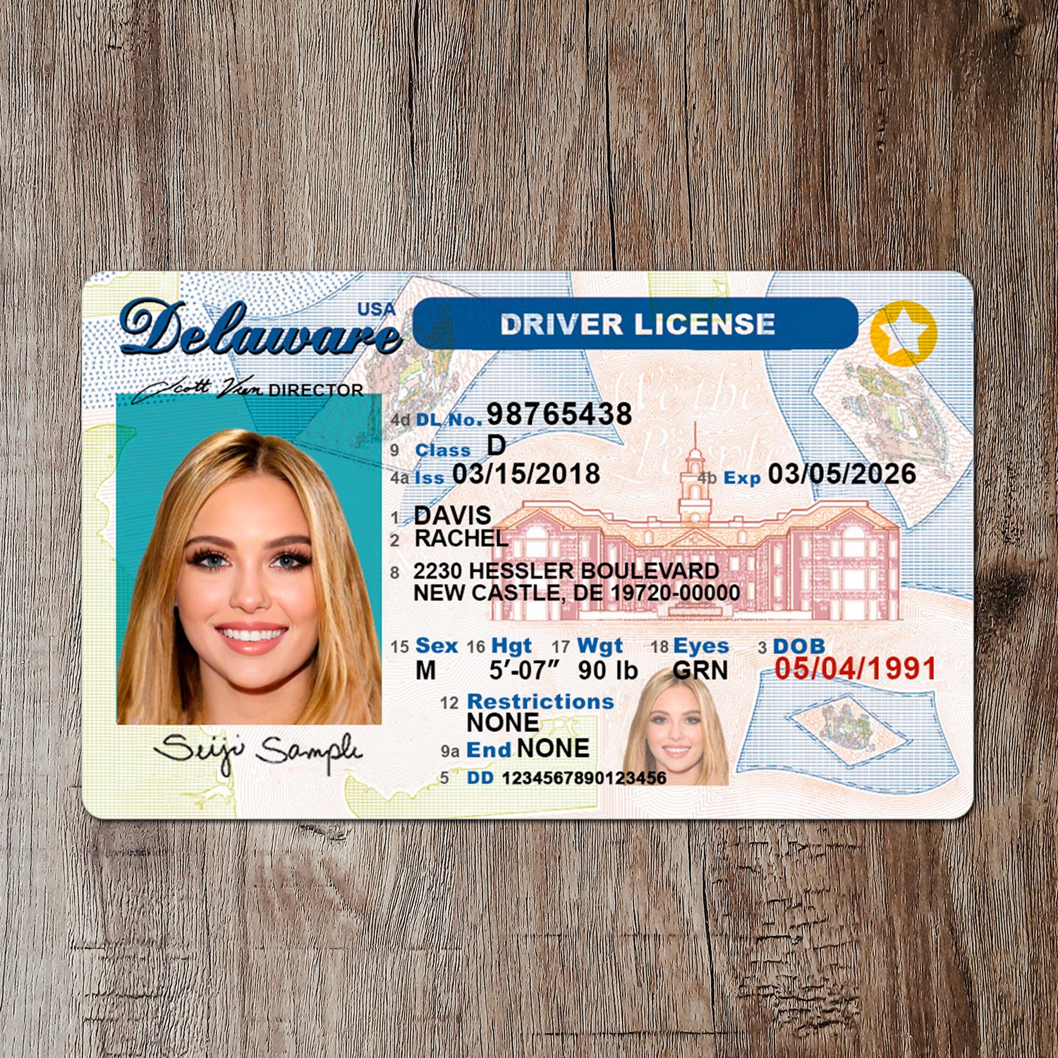 This editable Photoshop PSD is crafted to match the layout and visual DNA of real Delaware state IDs — making it perfect for creative, private or presentation-only purposes.