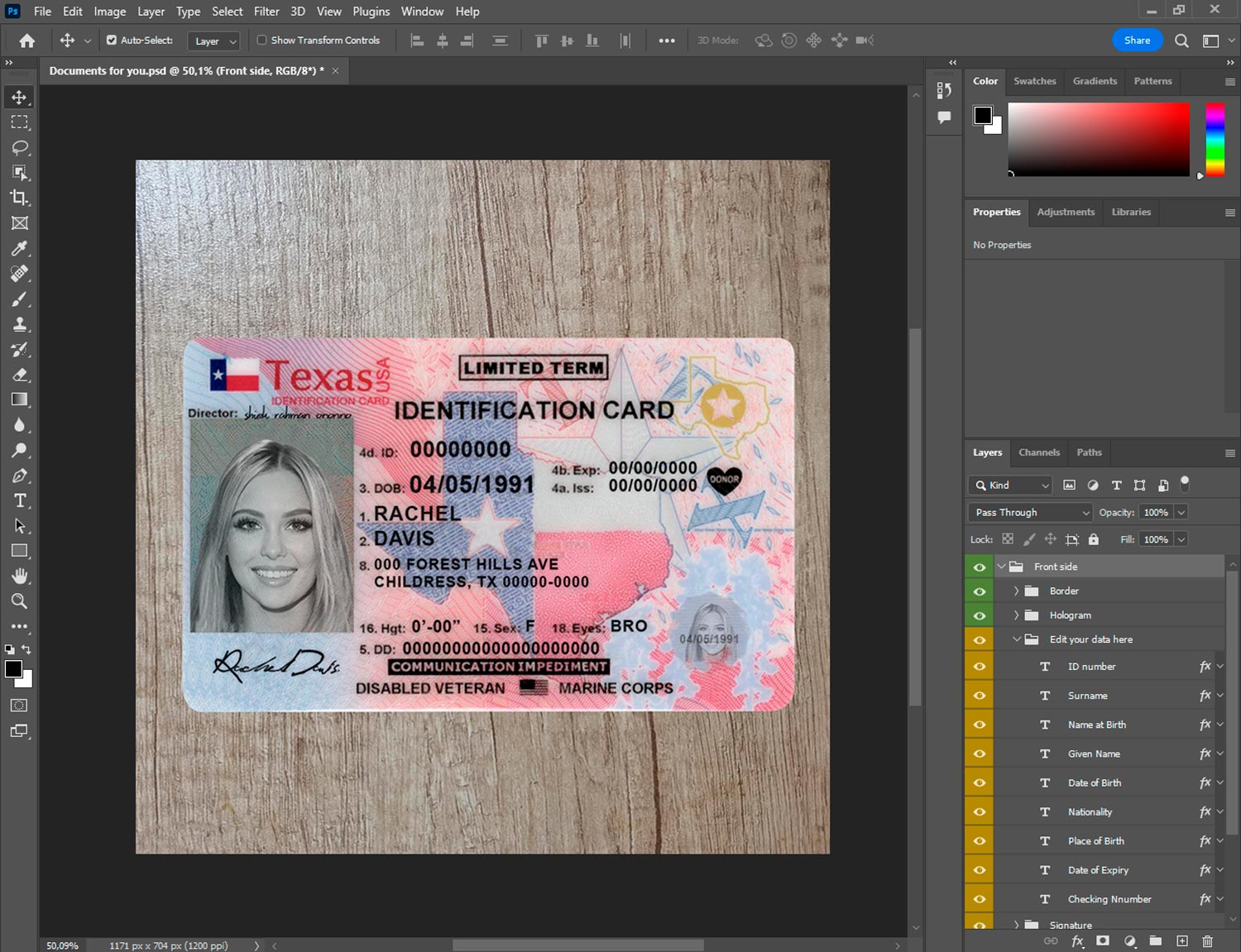 Our PSD file is suitable for program such Photoshop and you can easily edit it and it will quickly be customize where you can change everything + package includes its fonts. It is easily editable and needs basic knowledge of Photoshop, but it is a hard program, so if you don’t know how to use Photoshop, please contact us. We have a custom service with photoshop help and etc. For example, the Texas ID template can be used for reading purposes, but it works fine for online verification of any sites for example: Bet365, Poker Sites, William Hill, PayPal, Facebook, Skrill, Neteller, Binance, Coinbase, Ebay, Crypto Curency Wallets/Sites, Any Kinds of similar sites … * We respect all countries laws and We are not responsible for using these files for illegitimate purposes. They are created just for reading and informational use. All files on this web site do not break any laws because they are just pictures* File download immidiately after buying: -Texas ID template front.psd + back.psd -Scanned version/Printable version psd -4 absolutely new real backgrounds -Original Fonts -Video “How to use Photoshop and how to use our template” -Bonus file