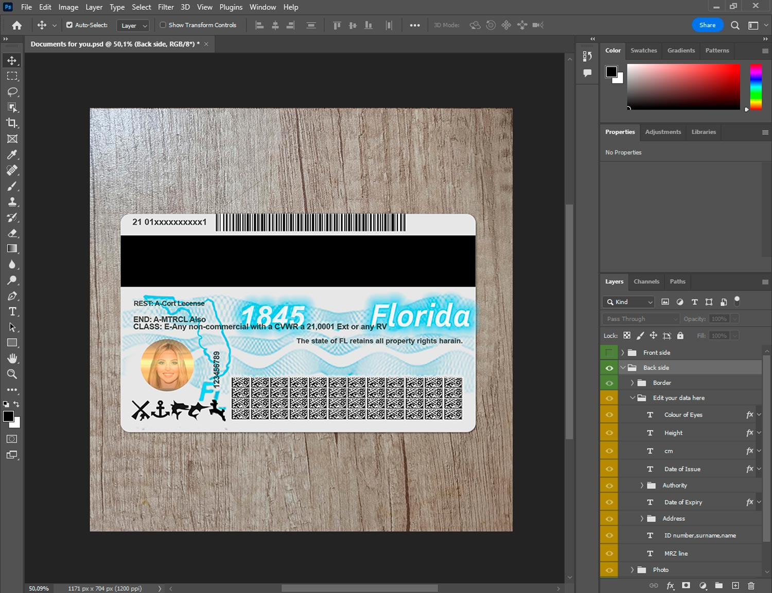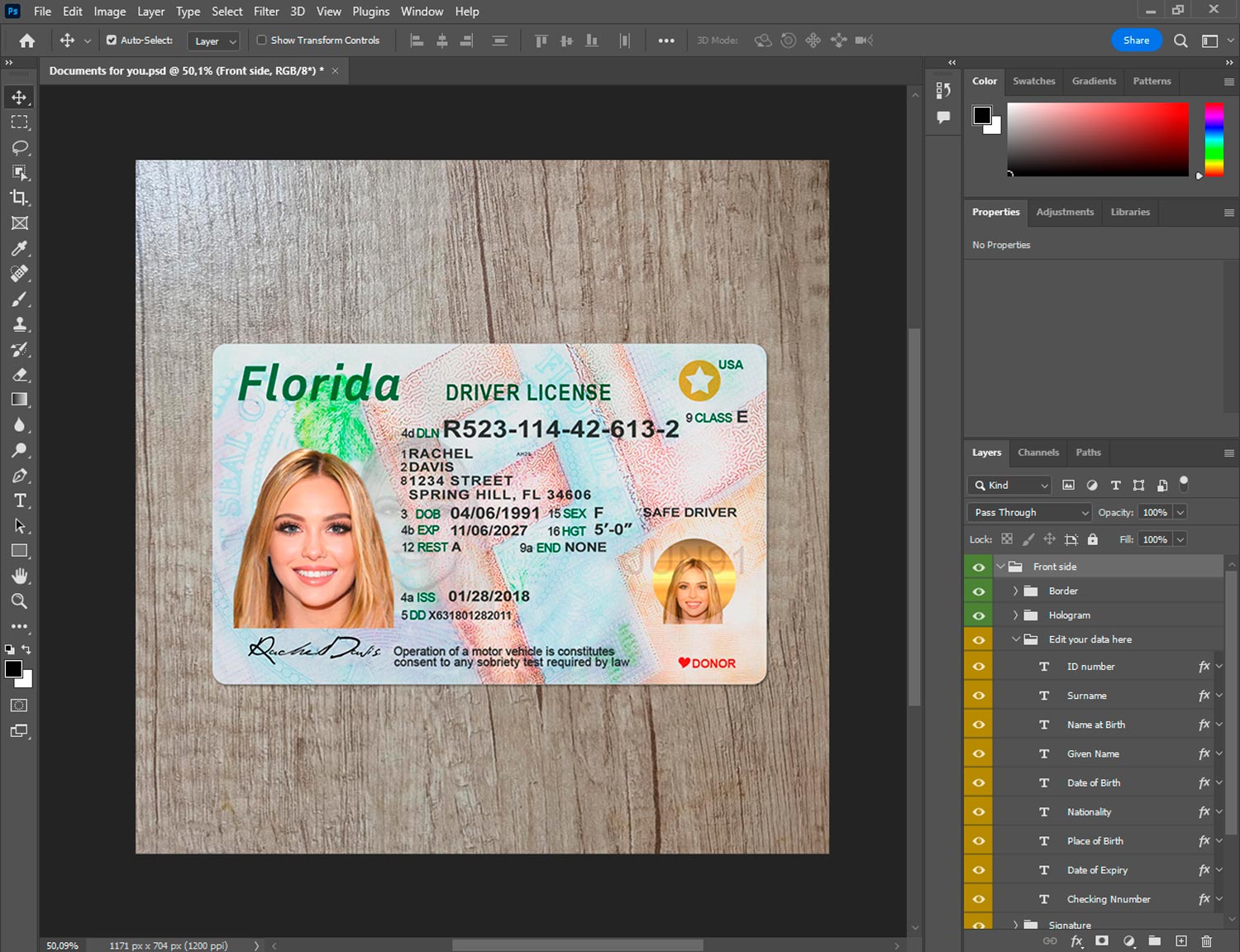 Customizable Florida driver license front side in Photoshop