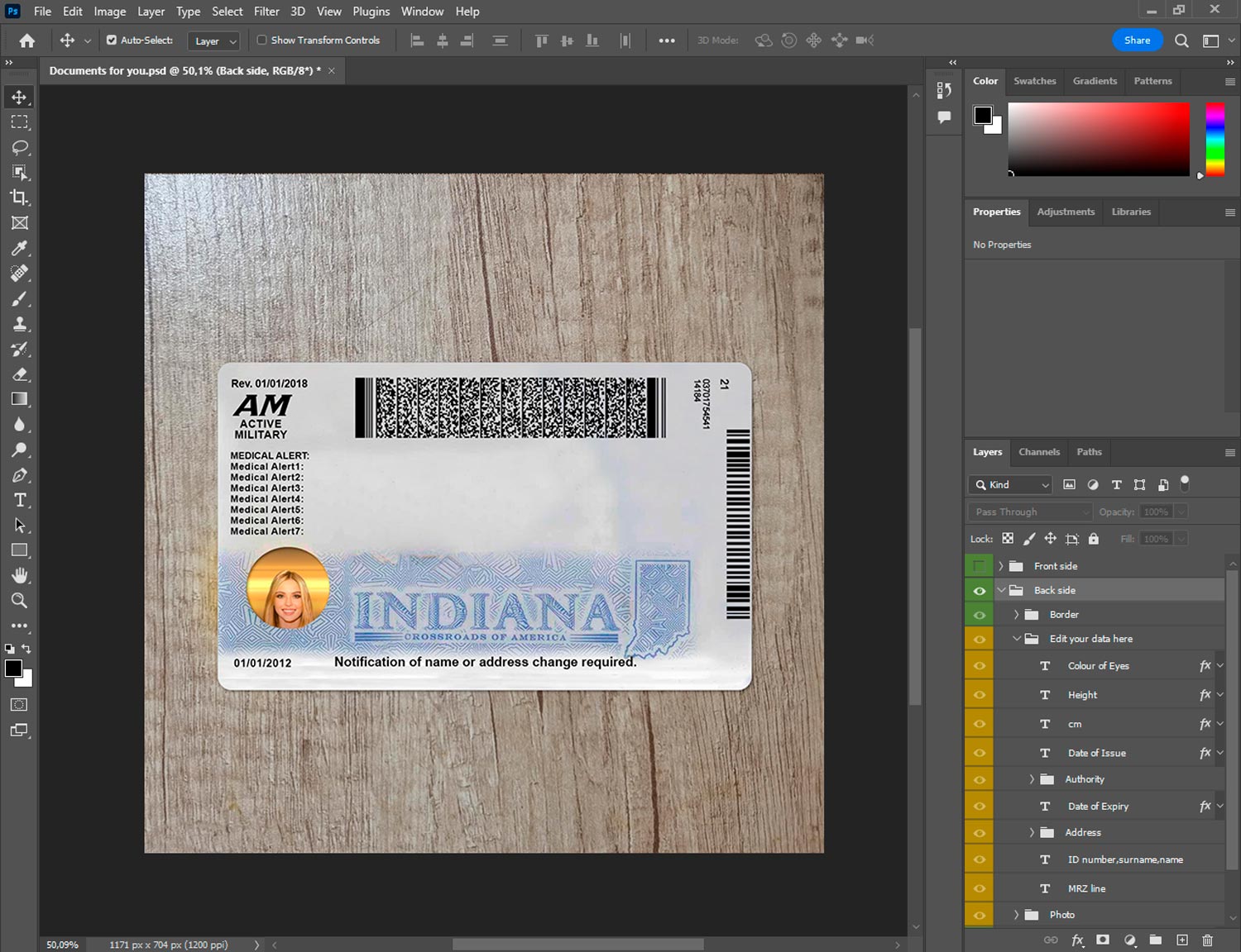 -Indiana ID template front.psd + back.psd