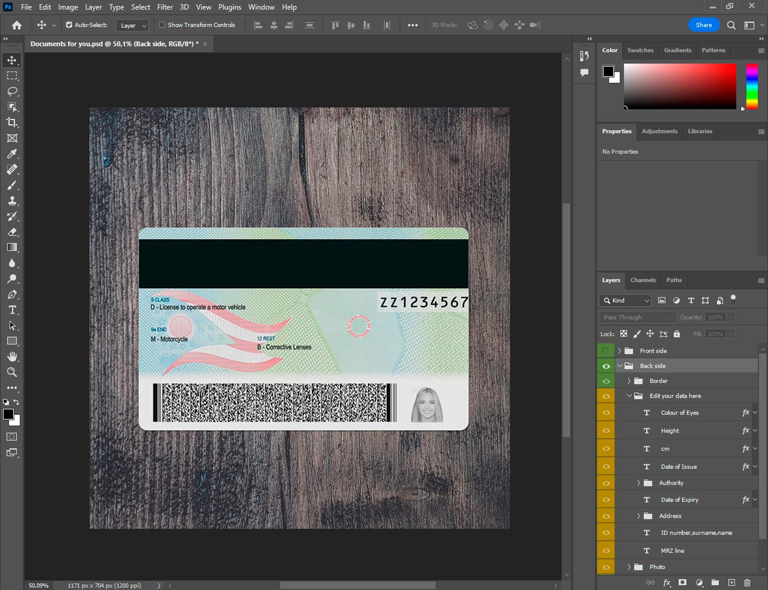 Ohio driver’s license maker—DIY template for Photoshop. Modern DMV-style design, organized layers, and included fonts. Print at 300 DPI to PDF/JPEG. Visual mock only—no magstripe/RFID encoding. CR-80 size with bleed marks, smart-object photo and signature, editable ID details.