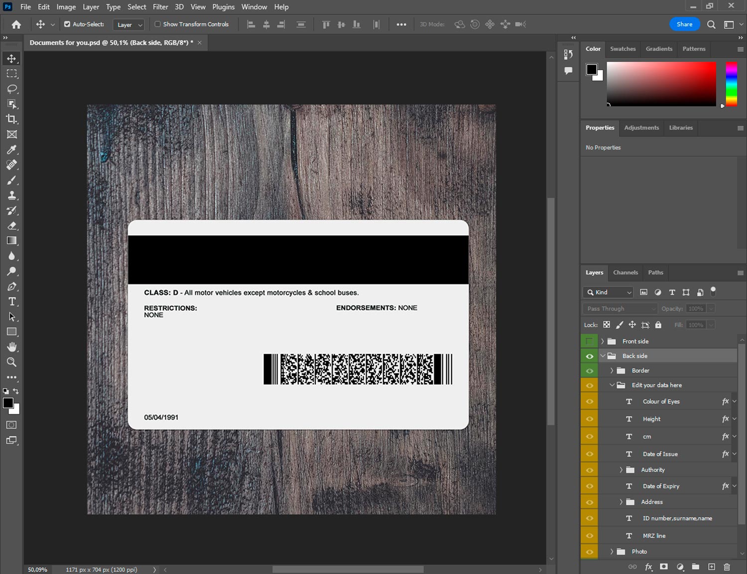 Customizable fields: full name, birthdate, address, ID number, issue/expiry dates, signature, barcode, and photo
