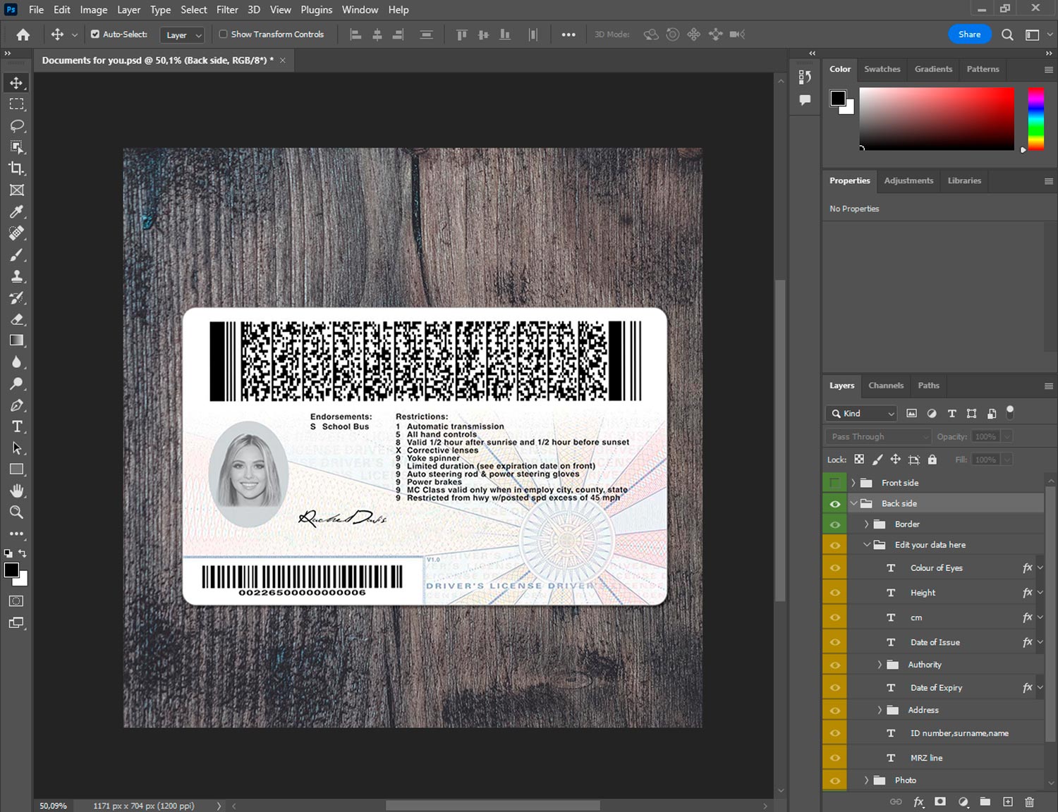 Authentic layout structure: name, ID number, address, DOB, signature, photo, barcode