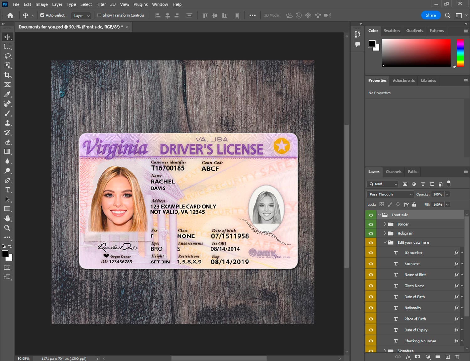 Virginia driver’s license editor—PSD with smart objects for photo and signature. Customize text fields quickly for product walkthroughs and QA. 300 DPI PDF/JPEG export. Visual sample only—barcode zone is decorative. CR-80 sizing with trim marks.