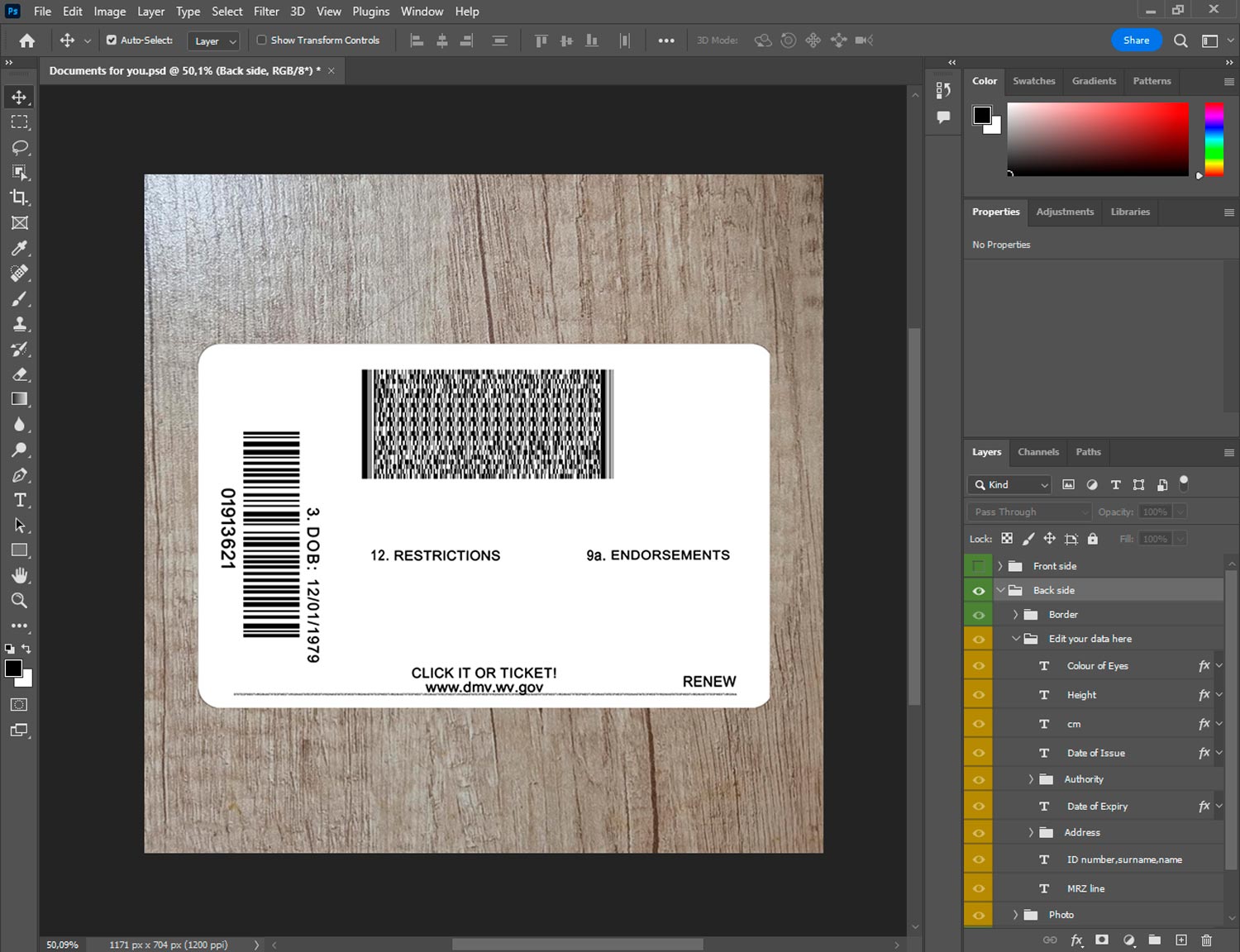 • Fields: name, license number, photo, address, birthdate, barcode, issue/expiry dates